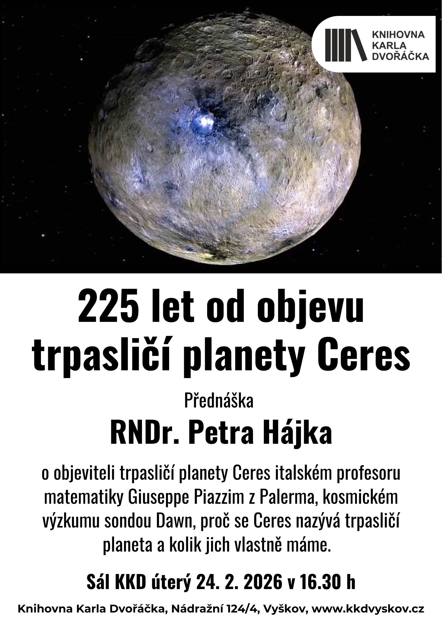 RNDr. Petr Hájek vás seznámí s objevitelem trpasličí planety Ceres italským profesorem matematiky Giuseppe Piazzim z Palerma, s kosmickým výzkumem sondou Dawn, proč se Ceres nazývá trpasličí planeta a kolik jich vlastně máme.