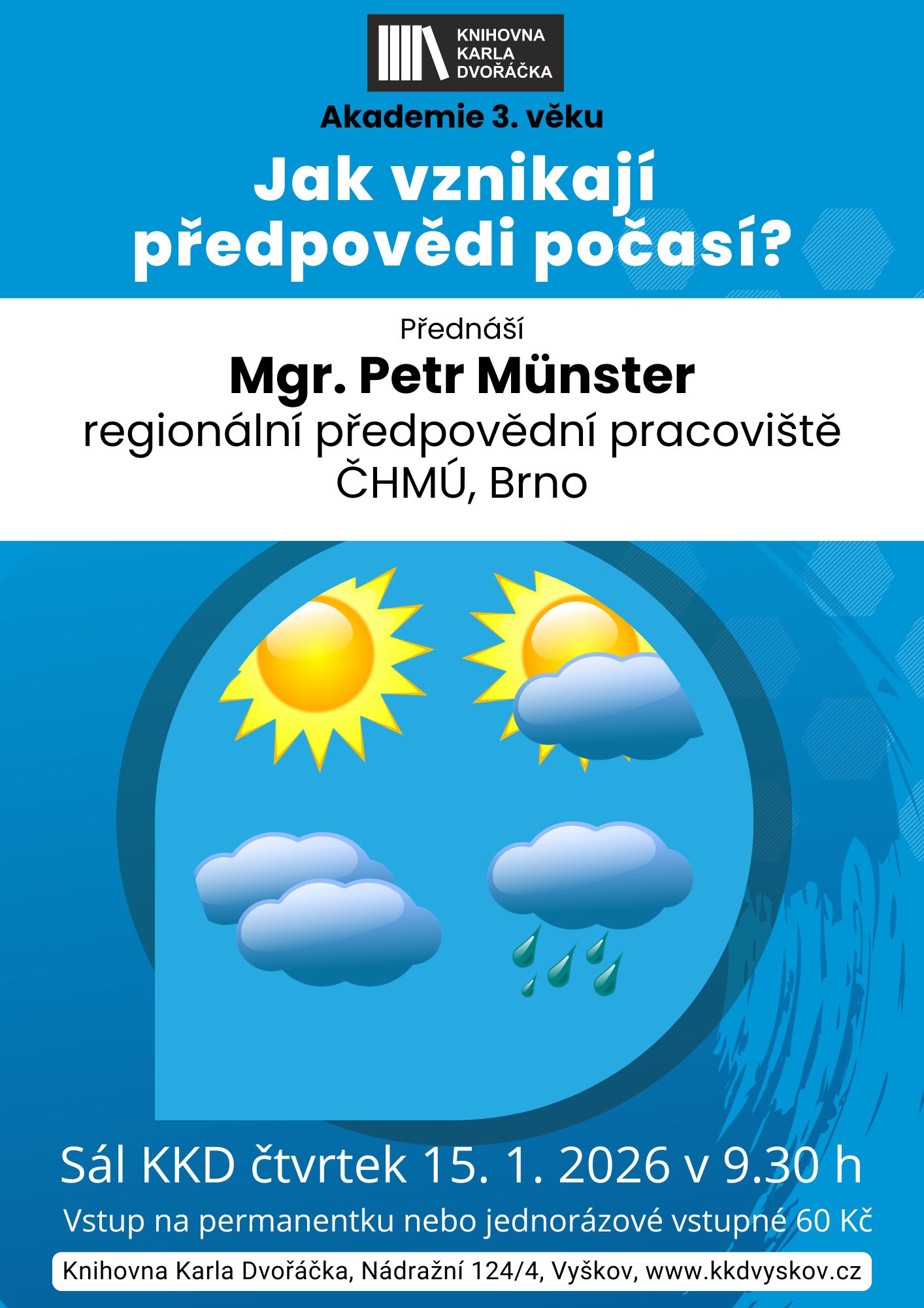 Přednáška Mgr. Petra Münstera, Regionální předpovědní pracoviště ČHMÚ, Brno. Počasí nás provází na každém kroku a v mnoha aspektech ovlivňuje naše životy. Abychom se pokusili počasí předpovídat, musíme mu nejprve porozumět. Jak vůbec vzniká předpověď počasí a jaká úskalí nese interpretace předpovědi? Nahlédněte prognostikům do kuchyně, předpověď si můžete i sami vyzkoušet. Vstup na permanentku, nebo jednorázové vstupné 60 Kč.