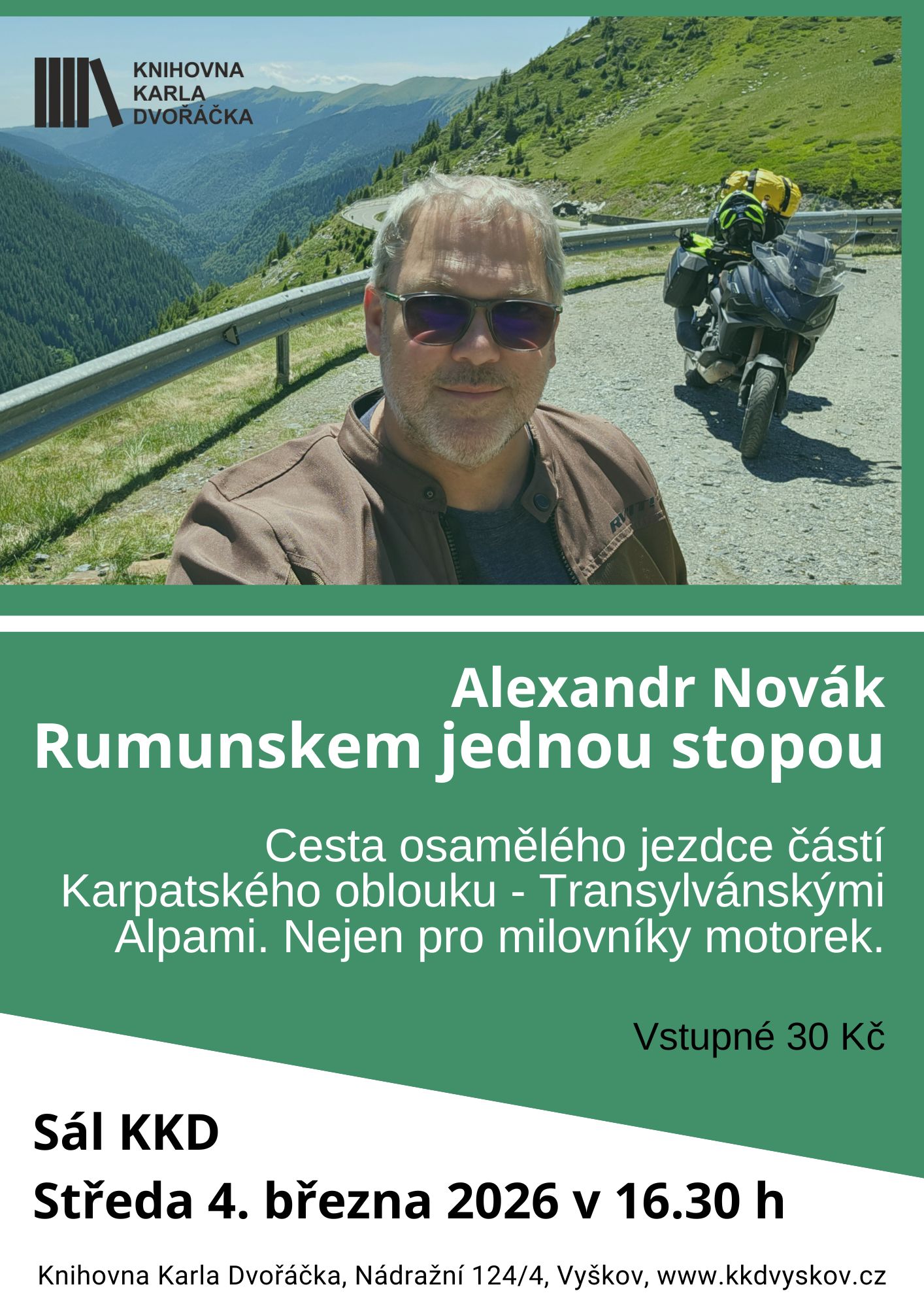 Rumunsko viděno z motorky. Cesta osamělého jezdce částí Karpatského oblouku - Transylvánskými Aplami. Nejen pro milovníky jedné stopy. Vstupné 30 Kč.