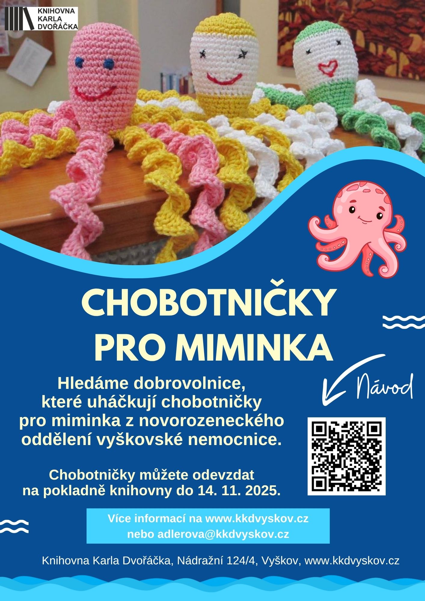 Knihovna Karla Dvořáčka ve spolupráci s Novorozeneckým oddělením Nemocnice Vyškov, přísp. org. hledá dobrovolnice, které uháčkují chobotničky pro miminka.