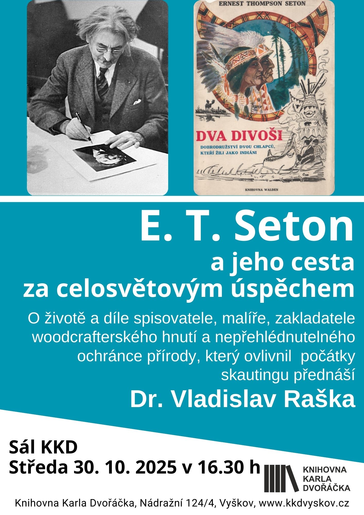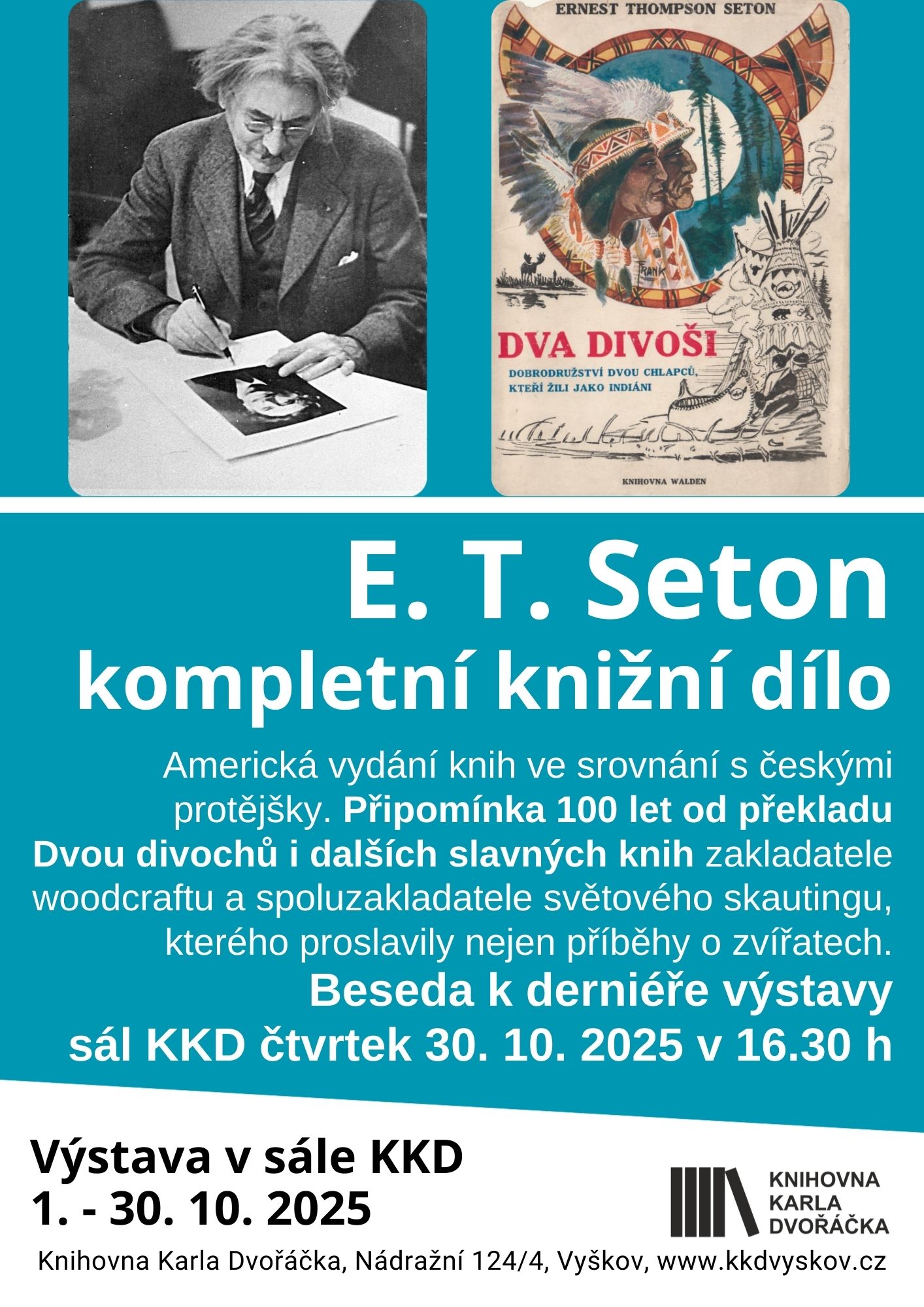 Výstava představuje americká vydání Setonových knih a umožnuje srovnání s českými protějšky. Připomíná rovněž 100 let od překladu Dvou divochů i dalších slavných knih zakladatele woodcraftu a spoluzakladatele světového skautingu, kterého proslavily příběhy nejen o zvířatech. České překlady nemají kvalitou i množstvím ve světě srovnání; připomínají i nedávno zesnulého, avšak nezapomenutelného spisovatele a překladatele Miloše Zapletala.