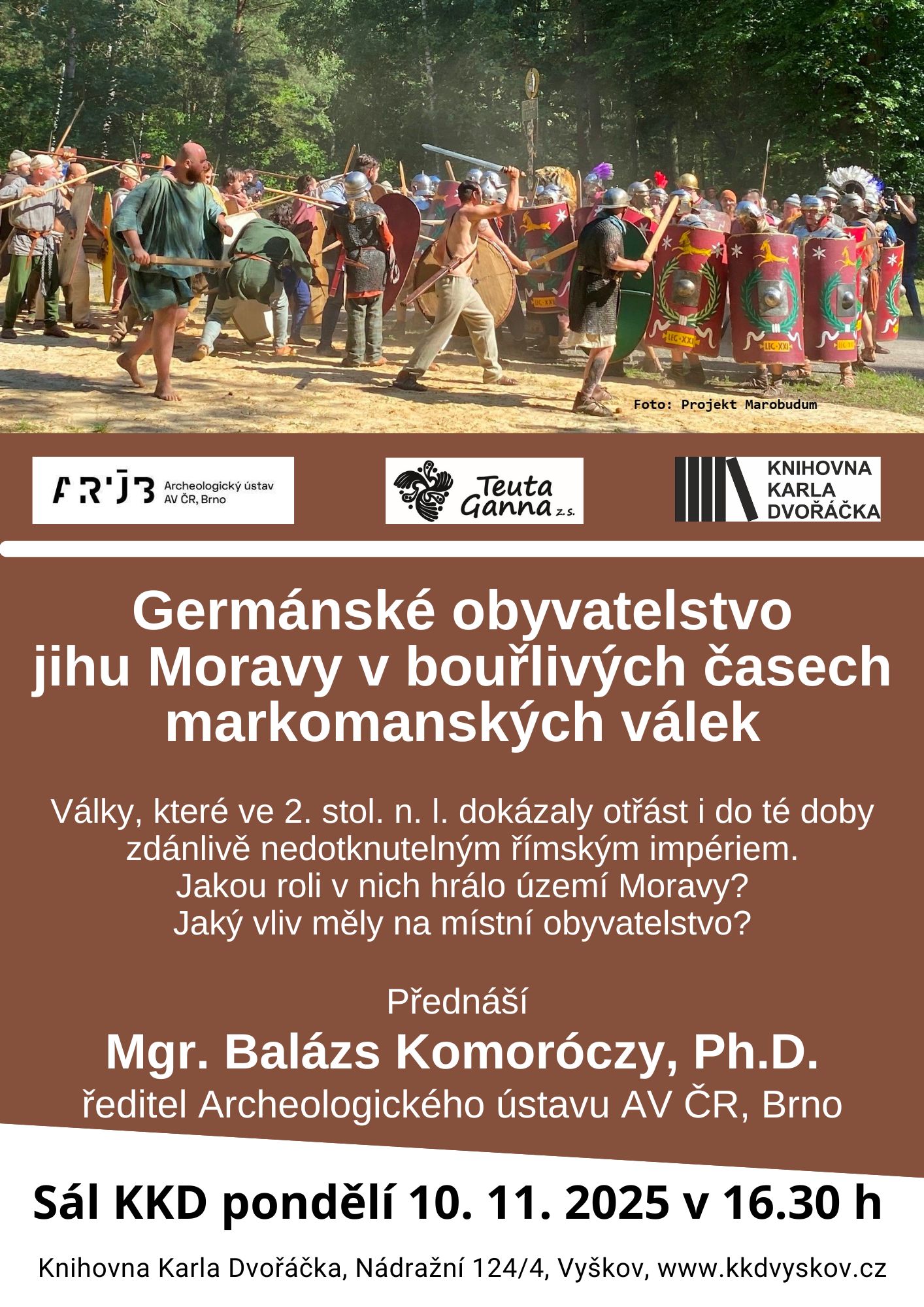 Proč k nim došlo, jak probíhaly a jak ovlivnily nejen samotnou Římskou říši, ale hlavně naši zemi, se dozvíte v pondělí 10. 11. 2025 Knihovně Karla Dvořáčka ve VYškově na přednášce "Germánské obyvatelstvo jihu Moravy v bouřlivých časech markomanských válek", kterou si pro Vás připravil ředitel Archeologického ústavu Akademie věd ČR, Brno, pan Mgr. Balázs Komoróczy, Ph.D. Přednášku ve spolupráci s KKD Vyškov zajišťuje spolek Teuta Ganna.