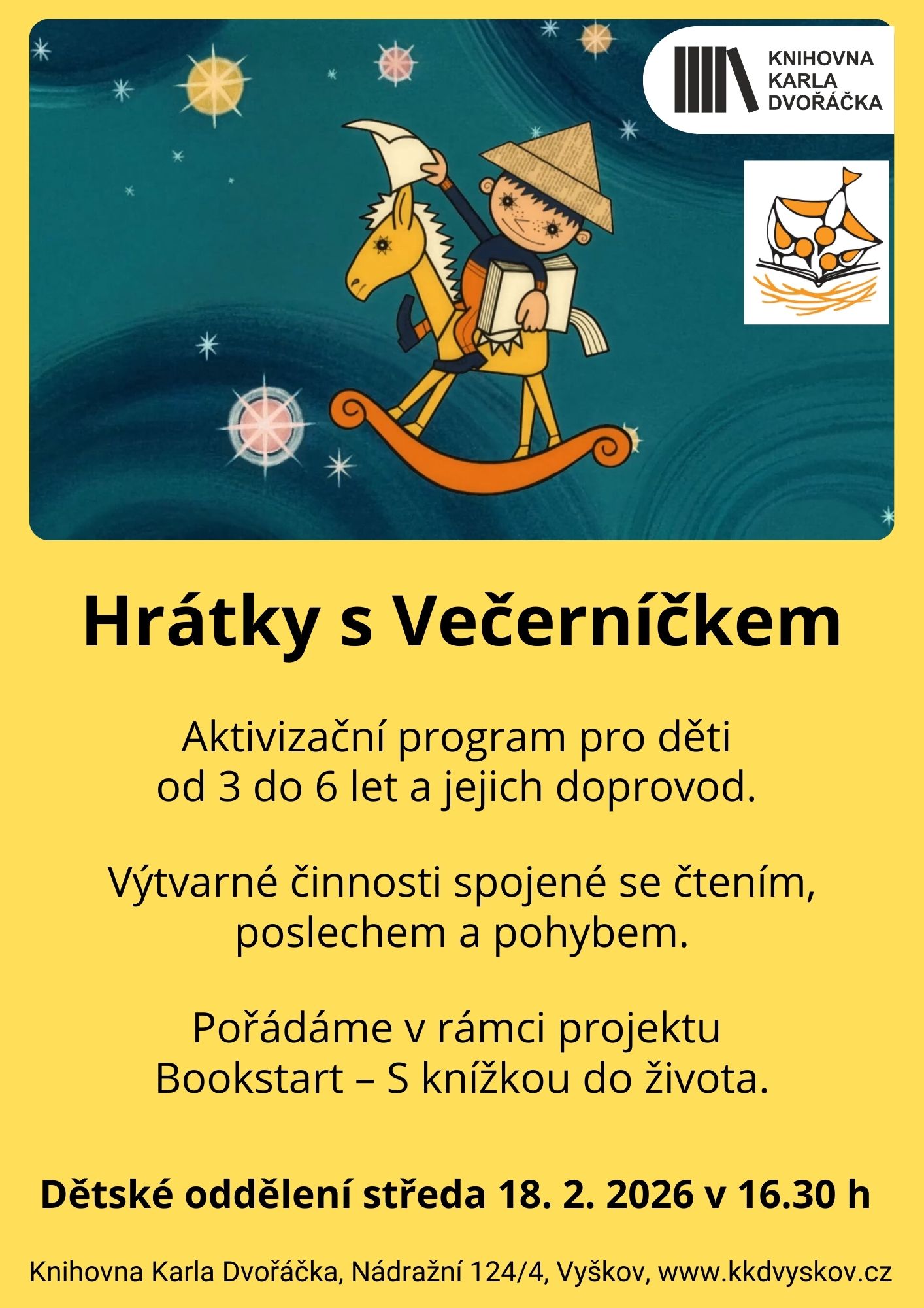 Aktivizační program pro děti od 3 do 6 let a jejich doprovod. Výtvarné činnosti spojené se čtením, poslechem a pohybem. Koná se v rámci projektu Bookstart – S knížkou do života.