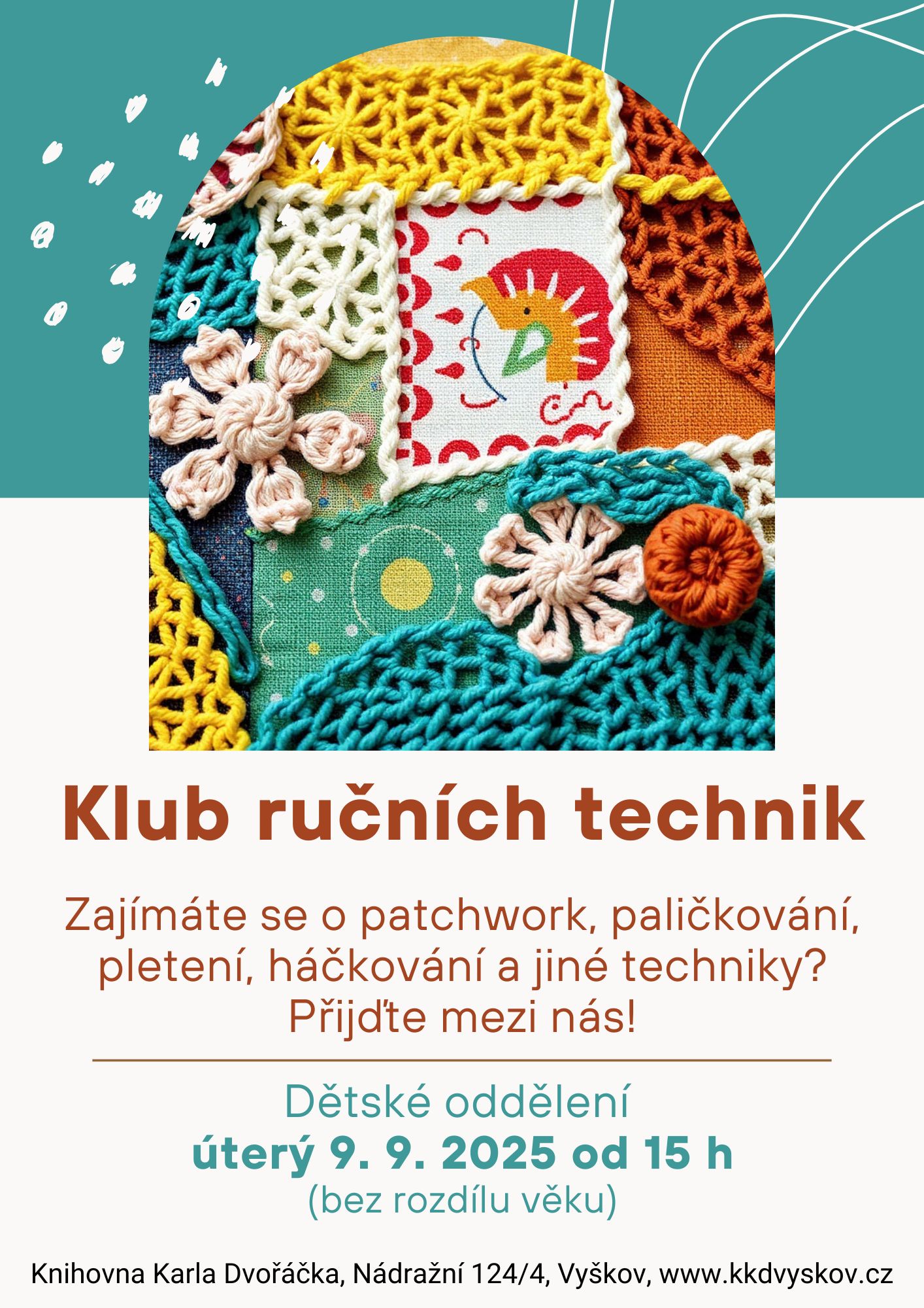 Zajímáte se o patchwork, paličkování, pletení, háčkování aj. techniky? Přijďte mezi nás! Bez rozdílu věku.