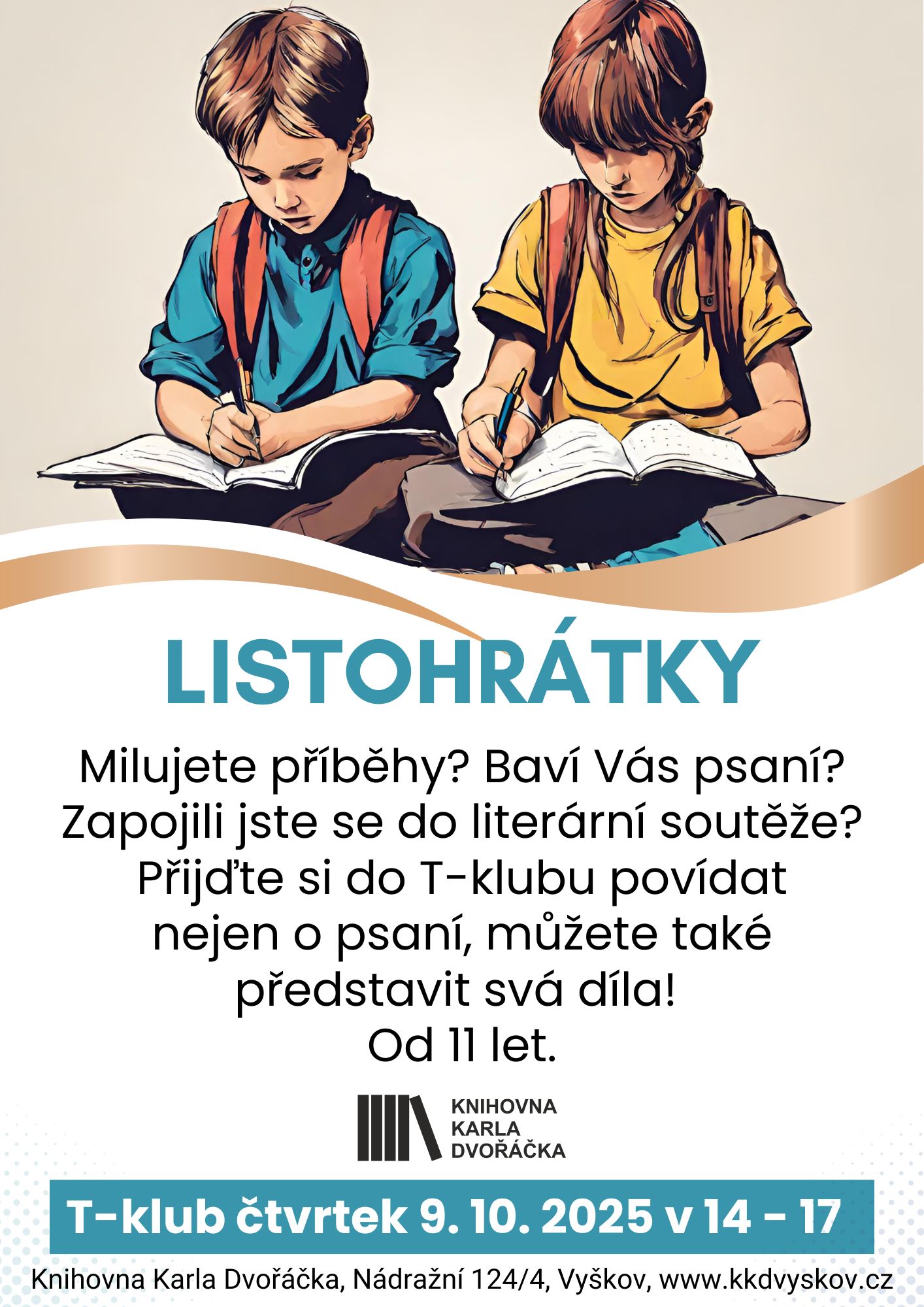 Milujete příběhy? Baví vás psaní? Zapojili jste se do literární soutěže? Přijďte si do T-klubu povídat nejen o psaní, můžete i představit svá díla! Od 11 let.