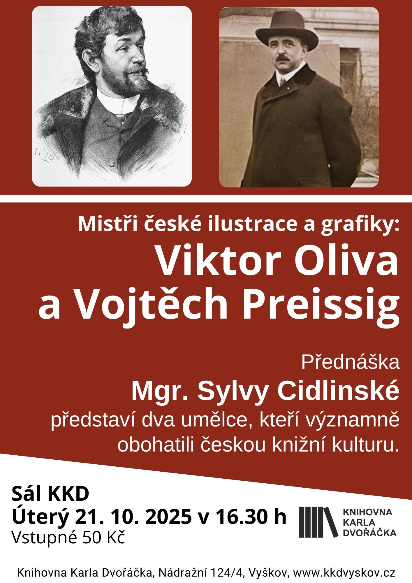 Přednáška Mgr. Sylvy Cidlinské představí dva umělce, kteří významně obohatili českou knižní kulturu. Viktor Oliva (1861-1928) byl známou osobností secesní Prahy. Pracoval pro slavné pražské nakladatelské domy, vytvářel ilustrace, knižní vazby, reklamní plakáty i monumentální malbu. Vojtěch Preissig (1873-1944) patřil bezesporu do okruhu nejvýraznějších českých umělců 1. poloviny 20. století. Proslul jako grafický designer, typograf a ilustrátor. Vstupné 50 Kč.