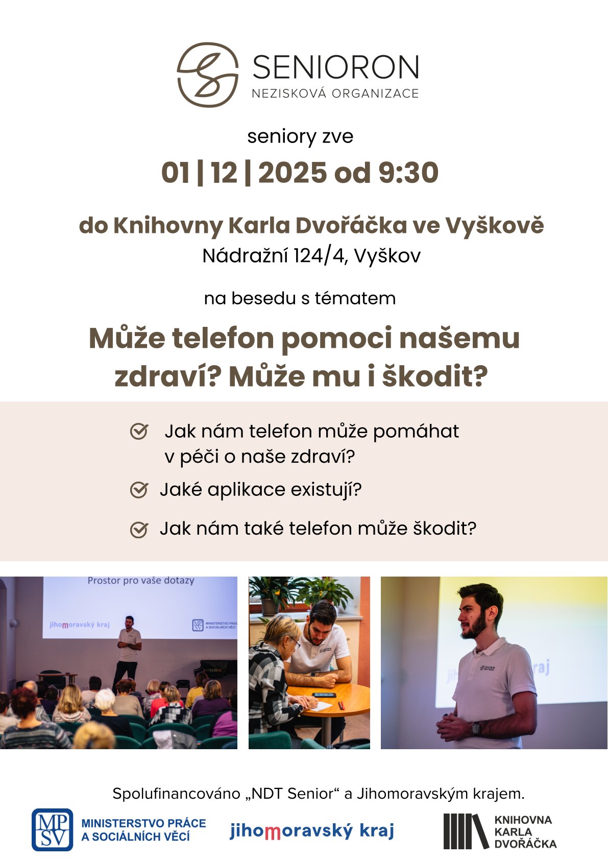 Jak může telefon pomáhat v péči o naše zdraví? Jaké aplikace existují? Beseda pro seniory. Zdarma. Počet míst omezen. Přihlášky osobně v knihovně nebo na emailu adlerova@kkdvyskov.cz. Ve spolupráci s SeniorOn, z.ú.