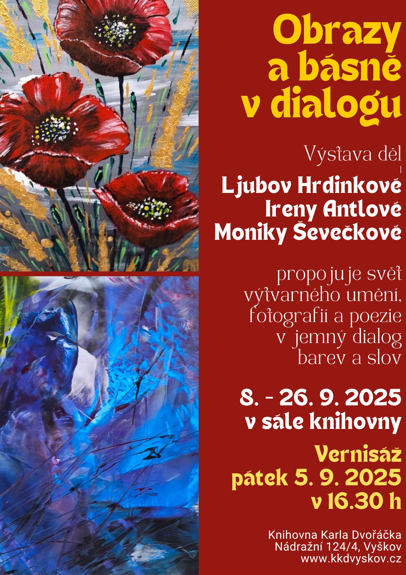 Zveme vás na vernisáž výstavy, která propojuje svět výtvarného umění, fotografií a poezie v jemný dialog barev a slov. Můžete se ponořit do nálad, které malba a fotografie zachycují a básně dokreslují, nebo naopak – kde slovo otevírá obrazům a fotografiím nové významy. Expozice nabízí prostor k zastavení, tichému rozjímání i sdílené inspiraci. Přijďte se potěšit obrazy a fotografiemi, které šeptají, a básněmi, co malují ticho.
