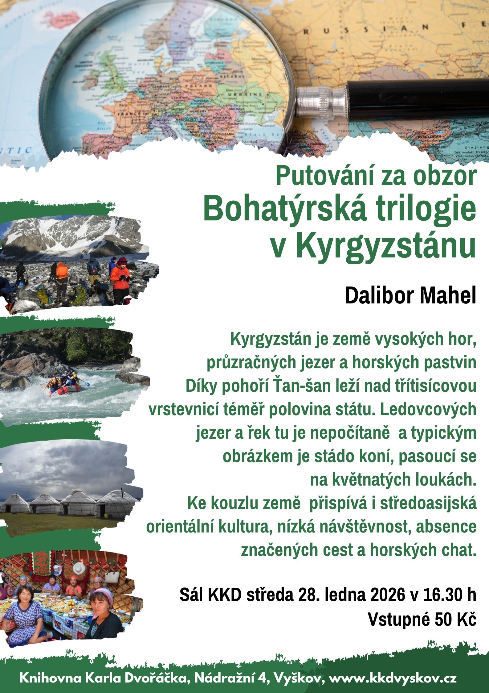 Kyrgyzstán lze bez jakéhokoliv přehánění nazvat zemí vysokých hor, průzračných jezer a horských pastvin. Díky pohoří Ťan-šan, vyplňujícímu celou zemi, leží nad třítisícovou vrstevnicí téměř polovina státu. Ledovcových jezer a řek tu je nepočítaně a typickým obrázkem je stádo koní, pasoucí se na květnatých loukách v sousedství zasněžených horských štítů. Ke kouzlu země přispívá i středoasijská orientální kultura, nízká návštěvnost, absence značených cest a horských chat. Návštěvník se zkrátka musí spolehnout na své síly - odměnou je mu zasloužená, ničím nezkalená radost z dobrodružství: při horolezení, v sedle koně, v raftu na divoké vodě. Společně vystoupáme po ledovcích na několik vrcholů, projedeme v sedlech koní horskými loukami s nocováním v tradičních jurtách a splujeme na raftu jednu z divokých řek a utáboříme se v divoké nepřístupné přírodě. Seznámíte se i s hlavním městem Biškekem, orientálními tržišti a tradičním lidovým uměním.