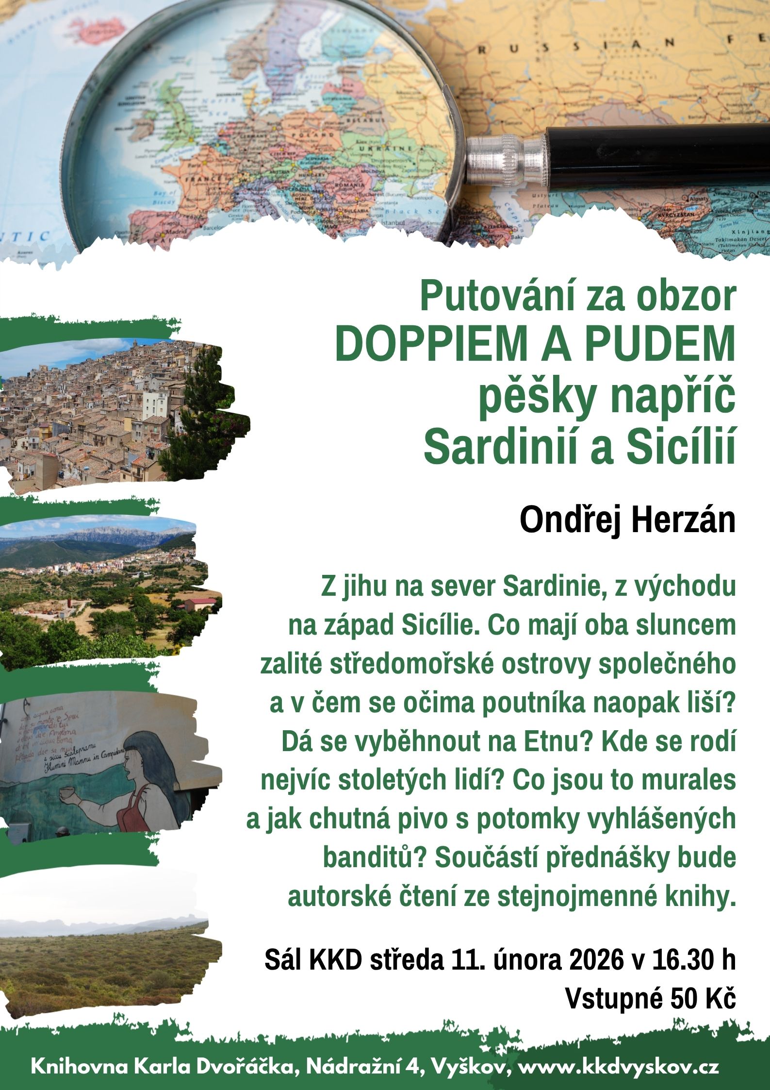Z jihu na sever Sardinie, z východu na západ Sicílie. Co mají oba sluncem zalité středomořské ostrovy společného a v čem se očima poutníka naopak liší? Dá se vyběhnout na Etnu? Kde se rodí nejvíc stoletých lidí? Co jsou to murales a jak chutná pivo s potomky vyhlášených banditů? Součástí přednášky bude i autorské čtení ze stejnojmenné knihy.