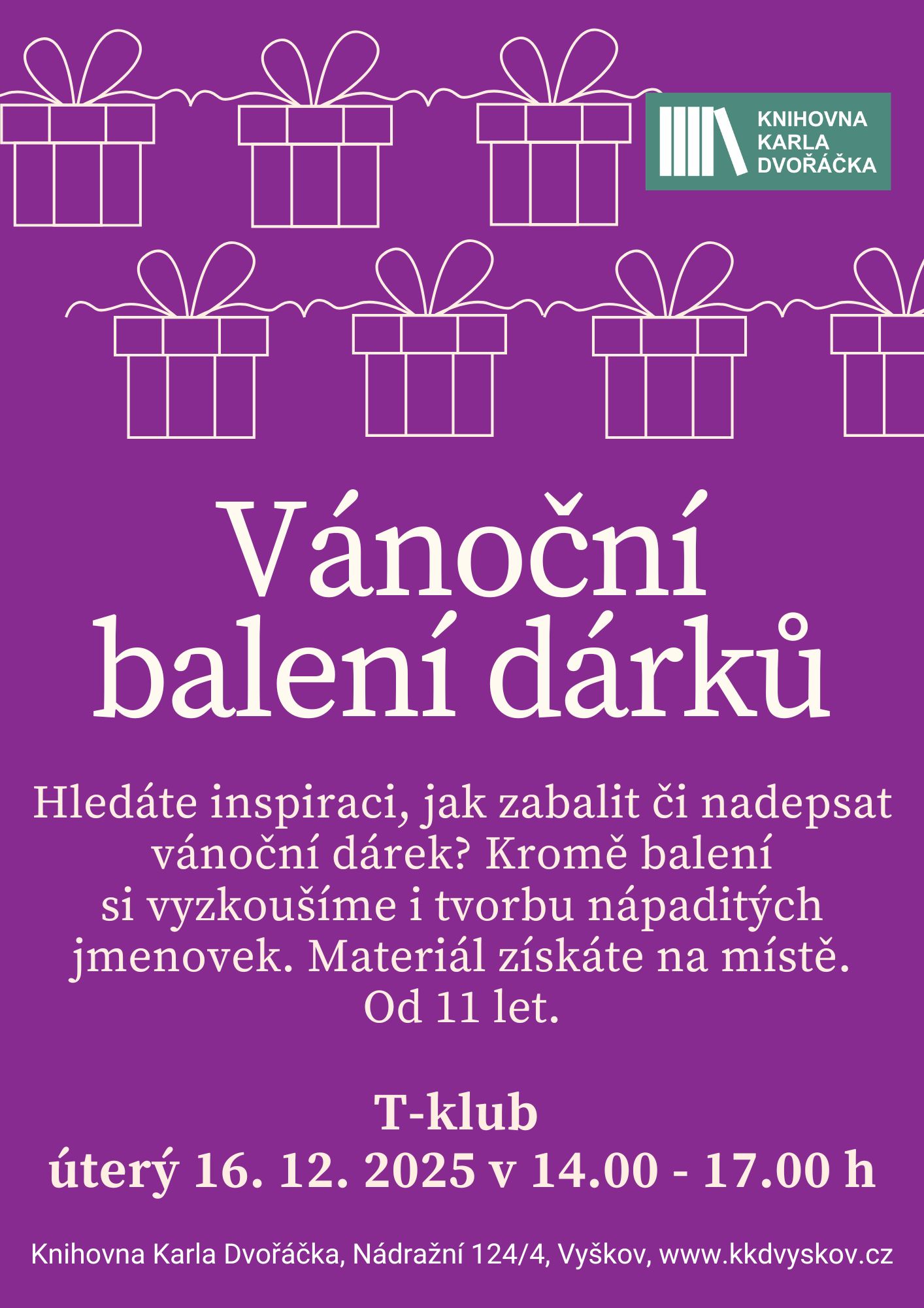 Hledáte inspiraci, jak zabalit či nadepsat vánoční dárek? Kromě balení si vyzkoušíme i tvorbu nápaditých jmenovek. Materiál získáte na místě. Od 11 let.