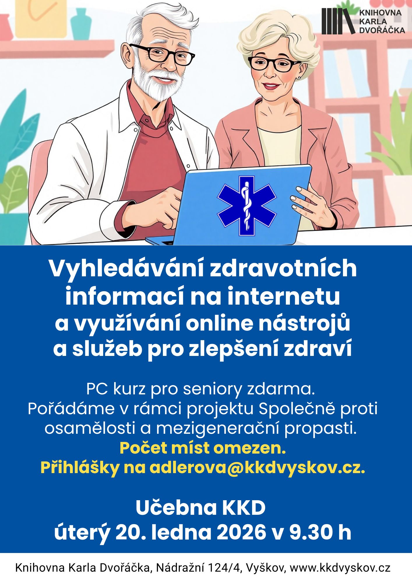 PC kurz pro seniory zdarma. Pořádáme v rámci projektu Společně proti osamělosti a mezigenerační propasti. Počet míst omezen na osm osob. V případě většího zájmu přidáme další kurz. Přihlášky na adlerova@kkdvyskov.cz.